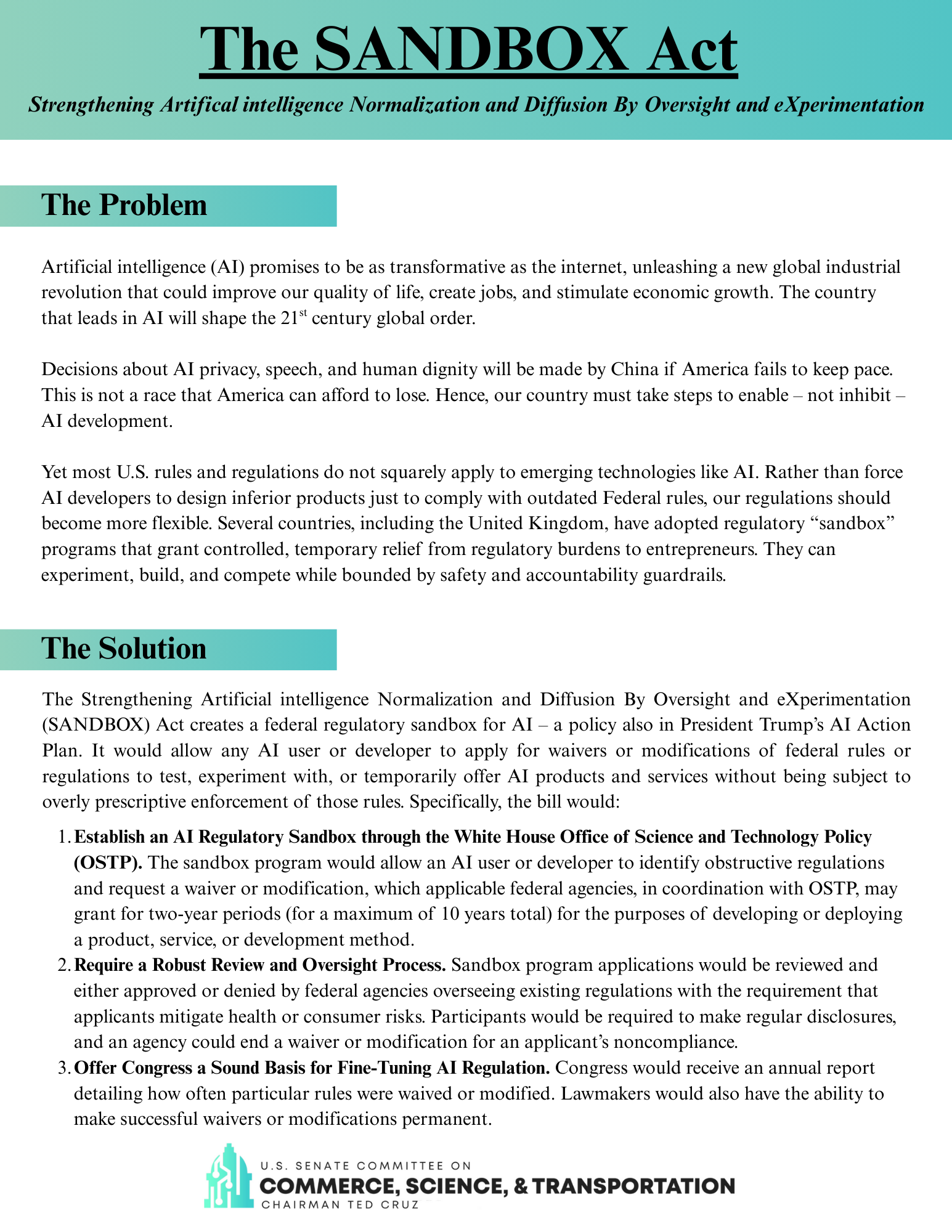 Senate Commerce Committee Chair Cruz releases legislation and framework for regulating artificial intelligence (AI): On September 10, Senate Commerce Committee Chair Ted Cruz (R-TX) released S. 2750, the “Strengthening Artificial Intelligence Normalization and Diffusion By Oversight and eXperimentation Act (SANDBOX) Act,” which would require the White House Director of the Office of Science and Technology Policy (OSTP) to establish a federal regulatory “sandbox program” for AI. The sandbox program, as Chair Cruz describes it, would allow OSTP and federal agencies to grant two-year waivers of federal regulations to AI developers to test and experiment with AI products and services. The bill includes requirements for federal agency oversight and annual reports to Congress regarding the frequency and use of waivers. Chair Cruz also released a framework for “light-touch” regulatory action, which includes five pillars: (1) Unleash American Innovation and Long-Term Growth; (2) Protect Free Speech in the Age of AI; (3) Prevent a Patchwork of Burdensome AI Regulation; (4) Stop Nefarious Use of AI Against Americans; and (5) Defend Human Value and Dignity. Announcing the bill, Chair Cruz stated that the bill would “encourage American ingenuity, improve transparency in lawmaking, and ultimately lead to safe, long-term AI usage domestically.”