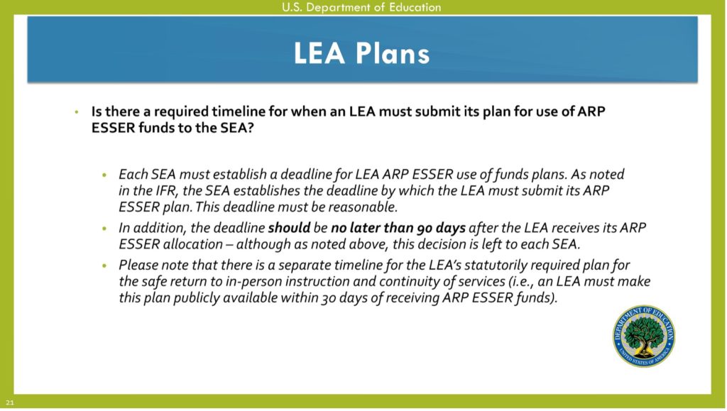LEA Deadlines: USED has further clarified that SEAs have the discretion to establish their own deadlines for their LEAs to submit ESSER use of funds plans so long as the timelines are “reasonable.” Importantly, a reasonable timeline can be more than 90 days after receipt of ARP funding.