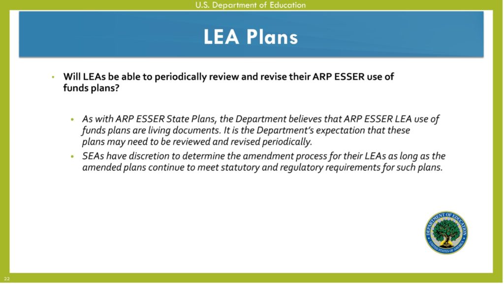 - Yet, in the same 5/27 “Office Hours” presentation (slide 22), USED noted: “As with ARP ESSER State Plans, the Department believes that ARP ESSER LEA use of funds plans are living documents. It is the Department’s expectation that these plans may need to be reviewed and revised periodically.”