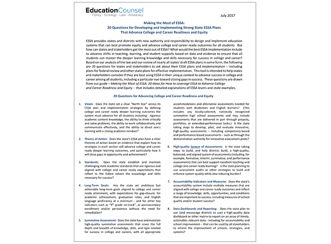 ESSA provides states and districts with new authority and responsibility to design and implement education systems that can best promote equity and advance college and career ready outcomes for all students. But how can states and stakeholders get the most out of ESSA? What would the best ESSA implementation include to advance shifts in teaching, learning, and student supports based on data and evidence to ensure that all students can master the deeper learning knowledge and skills necessary for success in college and career? Based on our analysis of the law and our review of nearly all states' draft ESSA plans in some form, the following are 20 questions for states and stakeholders to ask about their ESSA plans and implementation -- including plans for federal review and other state plans for effective implementation. This tool is intended to help states and stakeholders consider if they are best using ESSA in their unique context to advance success in college and career among all students, including a particular eye toward closing gaps in success. These questions are drawn from our guide - Making the Most of ESSA: 20 Ideas for How to Leverage ESSA to Advance College and Career Readiness and Equity - that includes more detailed explanations of systemic shifts, ESSA levers, and state examples.